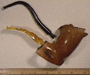 Beautiful high-gloss natural finish with two shank bridges. Straight flame-grain radiates from exact bottom of bowl. Includes both amber lucite and a double recurved german rubber stem.