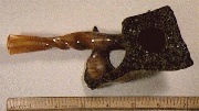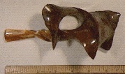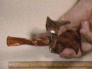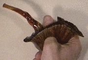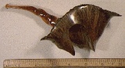Beautiful high-contrast high-gloss black finish with single side-sweeping arched bridge. Amber lucite stem.