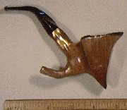 Beautiful tight grain. Sits on back "leg". Gold lucite shank extension and German rubber stem with ridges flowing from shank through into stem.
